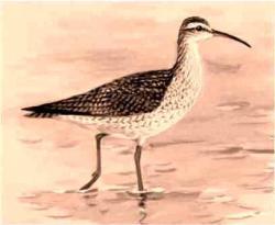 The Eskimo Curlew is a mottled brownish shorebird with long legs and a long, thin, slightly down-curving bill. It can be confused with its close relative, the Whimbrel, but is smaller (the size of a pigeon), has no barring or "stripes" on the under-wing feathers and its central head stripe is not as wide or well-defined.