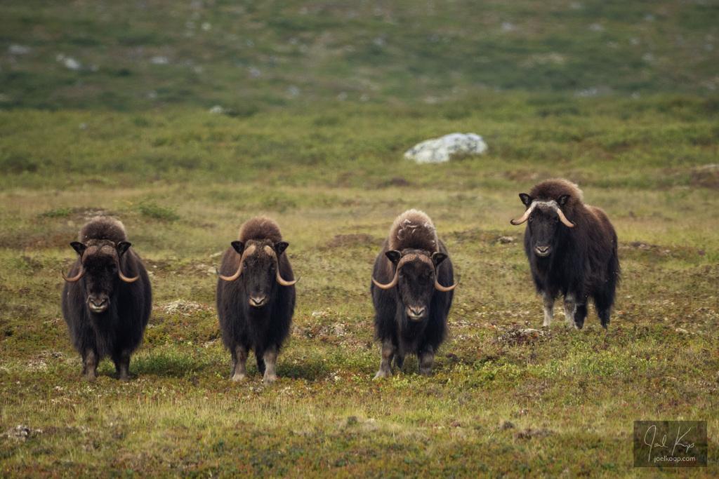 Muskoxen are very social animals. They live in loosely organized herds of about 15 animals, or sometimes larger.