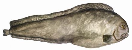 The Northern Wolffish is a marine fish with protruding front teeth and powerful jaws. Its head is small, with a small mouth, blunt snout and small eyes. Its body is long and stout with small or no pectoral fins. It has a uniform body colour, ranging from charcoal-black to dark chocolate.